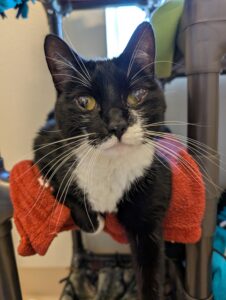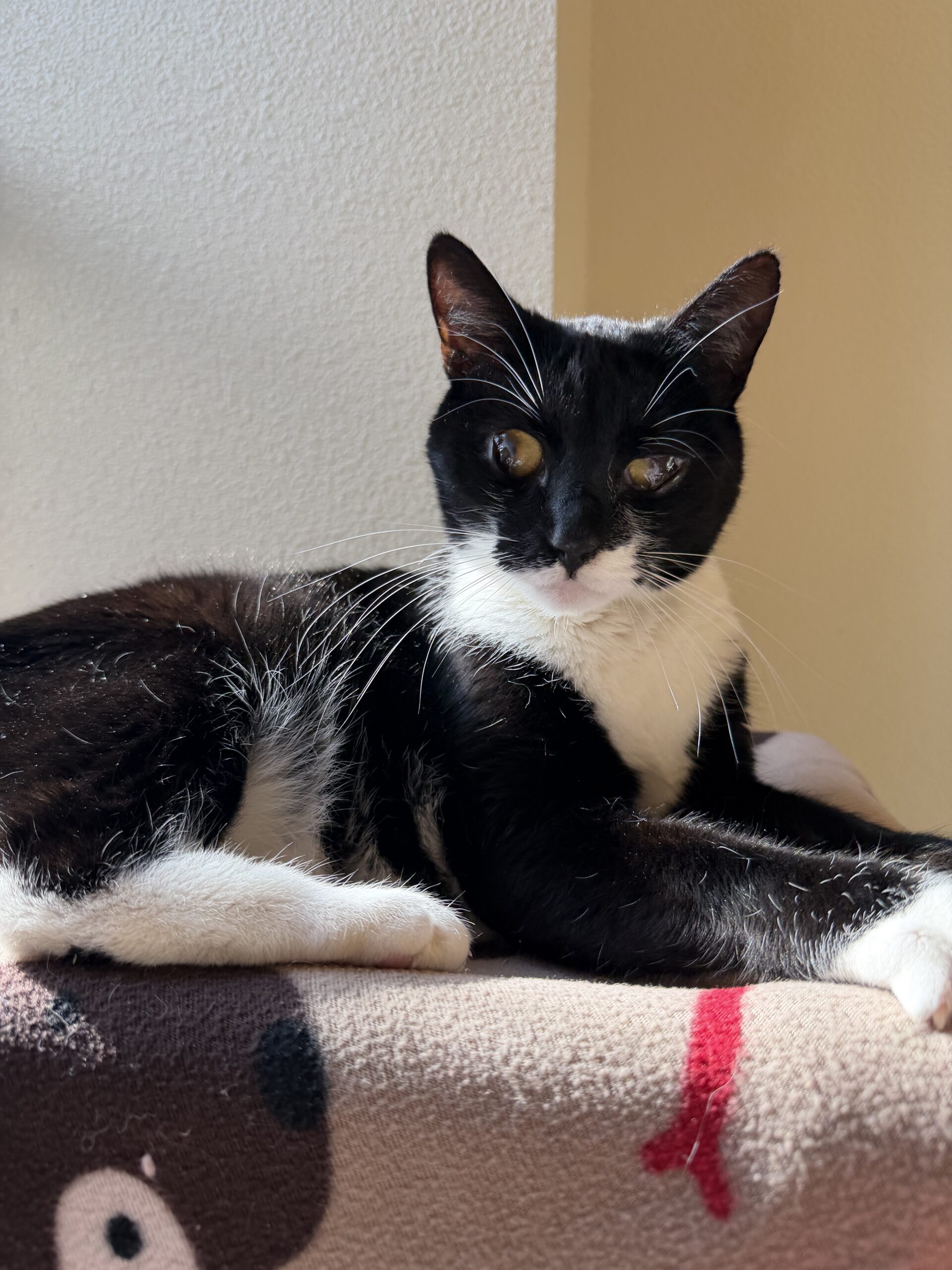 This cat has a condition in both eyes called “symblepharon,” it is more severe in the left eye compared to the right. It is likely that this cat previously had an infection in the eyes resulting in inflammation of the corneas (the clear part of the eye.). In an attempt to heal this infection and likely corneal ulcers, some of the surrounding tissues of the eye called conjunctiva attached to the cornea and became permanently healed there. While the function of the eye is normal, this tissue now permanently covers portions of the cornea. This limits vision the same way a curtain covering a window prevents you from seeing outside properly. This cat also has a condition called anterior synechia of the iris in the right eye. A portion of the iris (the colored portion of the eye) has become permanently stuck to the back of the cornea. The condition that affected the iris also caused some scarring of the cornea, creating a white patch on the surface of the eye. Fortunately, this cat’s partial loss of vision is not anticipated to negatively impact his quality of life and his eyes are currently comfortable. The adopting family may wish to purse consultation with a veterinary ophthalmologist at their expense to see if there is a surgical option to improve vision although success rates may be limited.